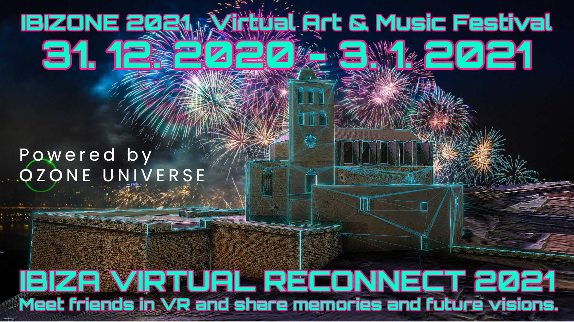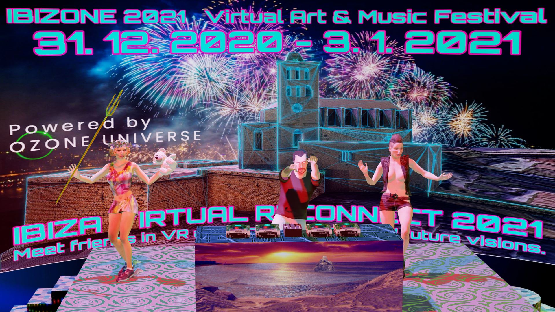 Party, share memories and future visions. IBIZONE is a virtual reality 3D Ibiza Environment for the 20/21 New Years Party. The event will be hosted online and is accesible from PC or Mac with internet connection or with many VR headsets. We will invite Ibiza DJs and performers to do streaming sessions, which we can see and hear in VR and dance along. Every Room can hold up to 36 people. With an audio headset we can chat with each other and enable the webcam to have a floating screen above the avatar. Navigation is like a computergame with keys and mous